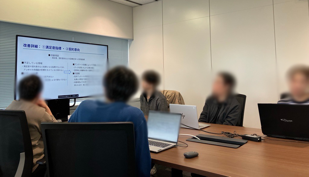 プロジェクトリーダーを中心に、各メンバーがアンケート分析の結果見えてきた現状の課題感や、現地取材をする中で紐解いた仮説の共有を行いました。そこからアンケートの改善案を提案、顧客側が現場ですぐに実行できそうな粒度まで落とし込むことができました。